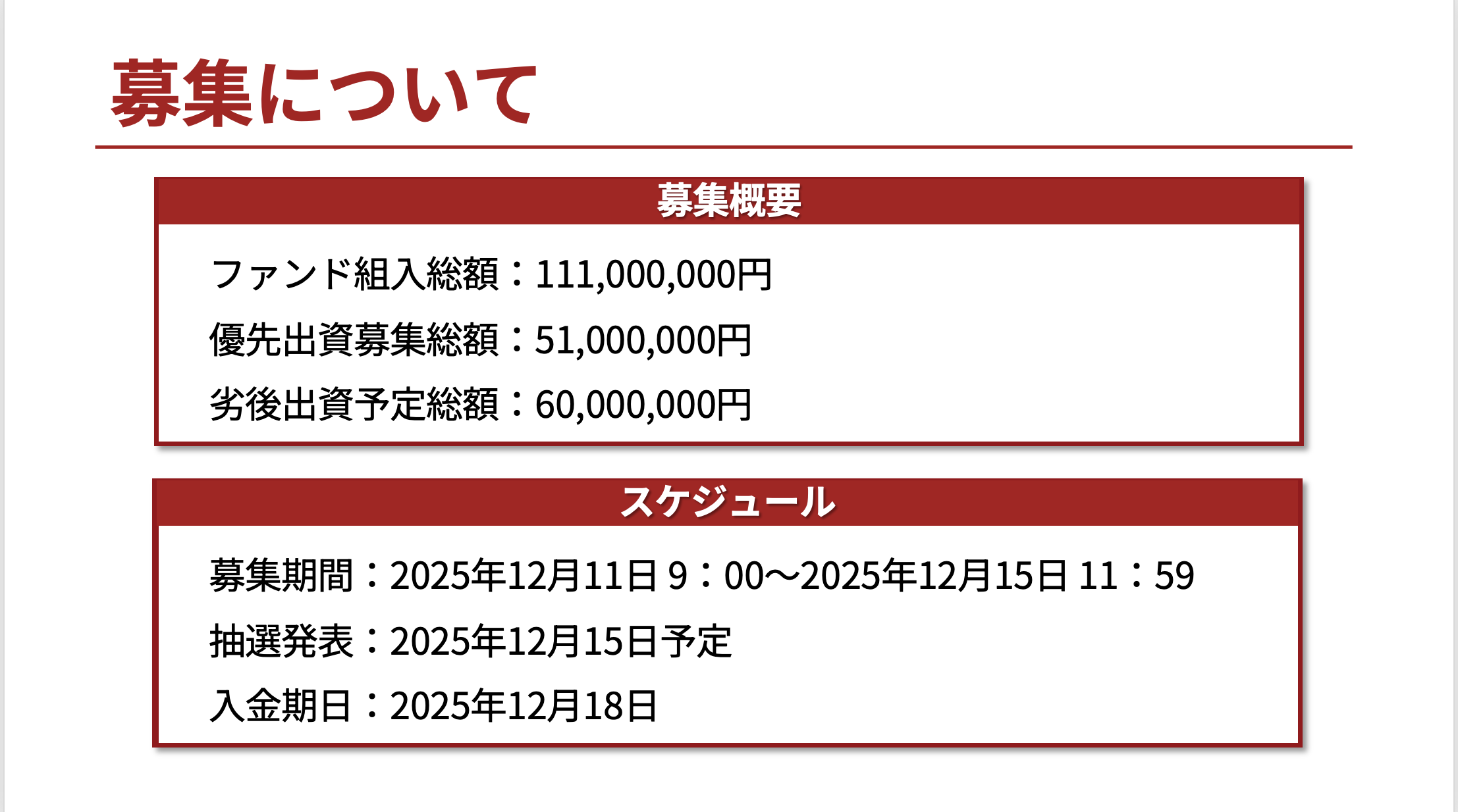 約6ヶ月間の運用期間で出資募集致します。(2025年12月15日募集締め切り)
